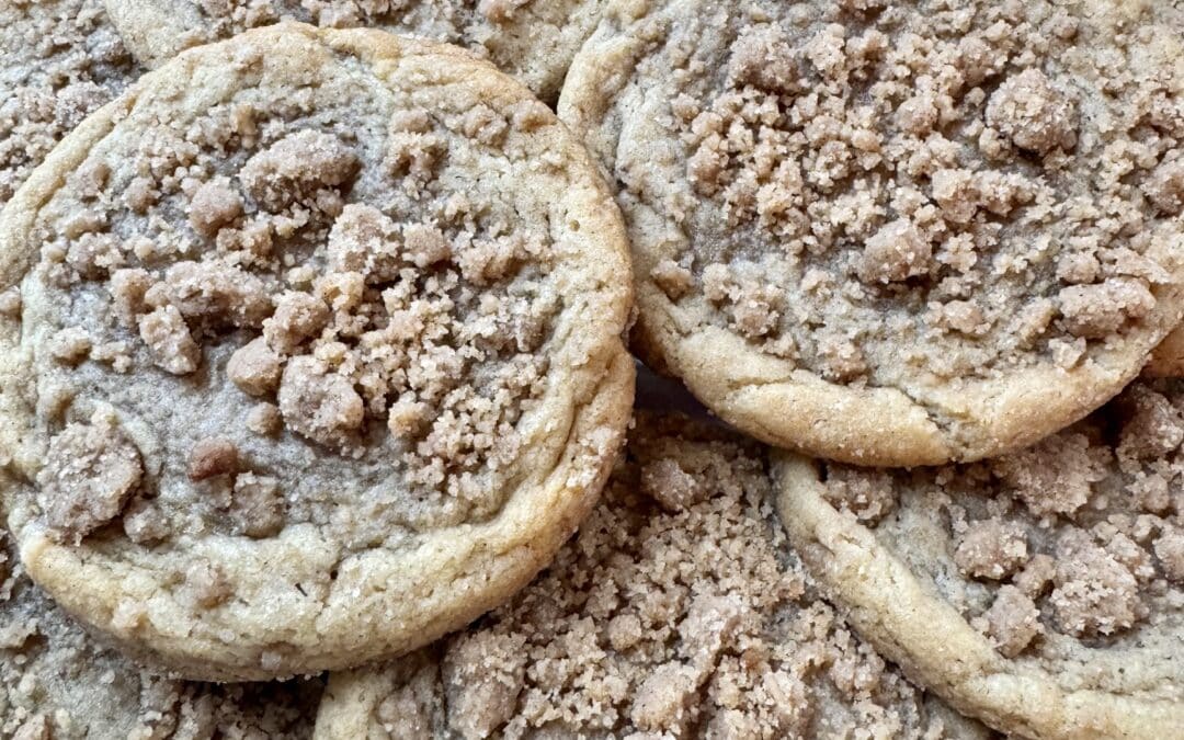 - First roll the edge of cookie into the streusel crumbles. Once the edge has crumbles, turn upside down and plant the top of the cookie dough into the streusel crumbles. Place on a cookie sheet lined with parchment paper. Add a pinch more streusel crumbles to the center of each cookie.
